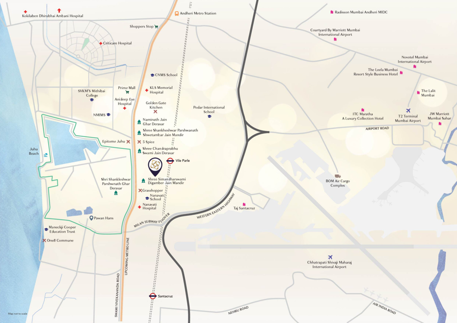 The Vile Parle West address gives genuine triple-mode connectivity through road, suburban rail and the metro, which is rare even in this part of Mumbai. The carpet areas of 1,125 and 1,138 square feet are usable 3 BHK formats, and the 2,172 square fo...